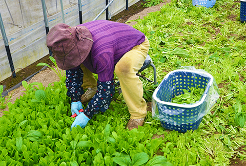 日の出の時間から、手作業で幼葉の収穫が始まり、気温が上がり始める時間まに刈り取り、お客様の手元に届けるまで徹底的な温度管理を行い、みずみずしく新鮮な物を提供します。